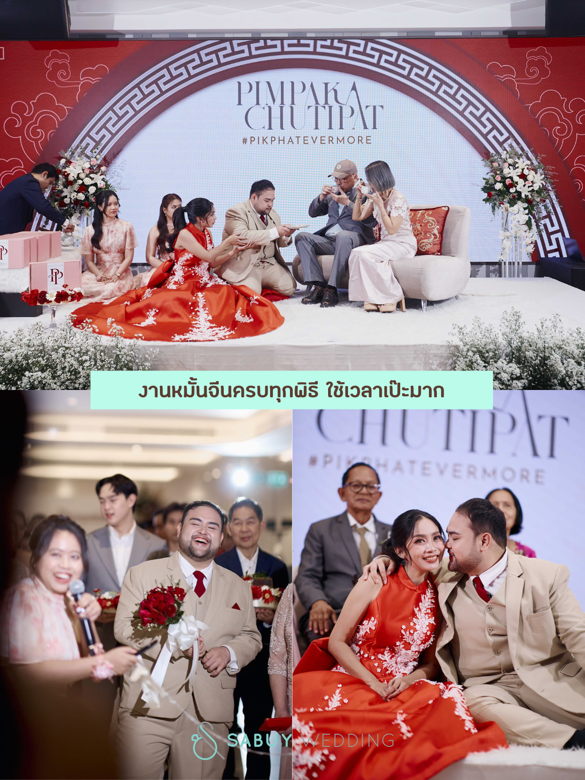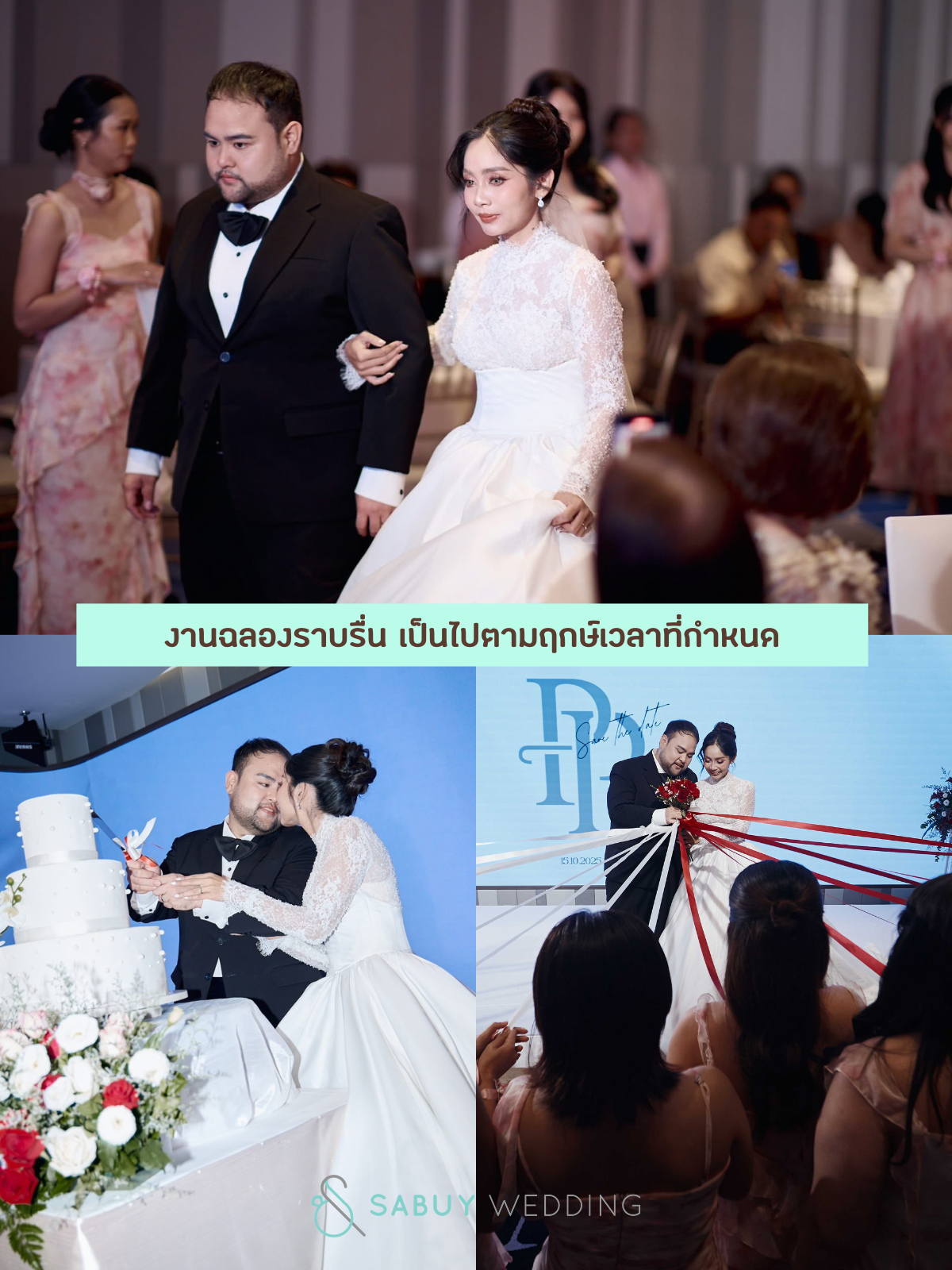 - ช่วงพิธีเริ่มจากรับเจ้าสาวขึ้นเวที เปิด Presentation ให้แขกชม ต่อด้วยประธานกล่าวอวยพรและตัดเค้ก 🎂 กล่าวขอบคุณแขก ดึงริบบิ้นช่อดอกไม้ 💐 ปิดท้ายด้วยการตั้งขบวนขึ้นห้องพักตามฤกษ์ส่งตัว