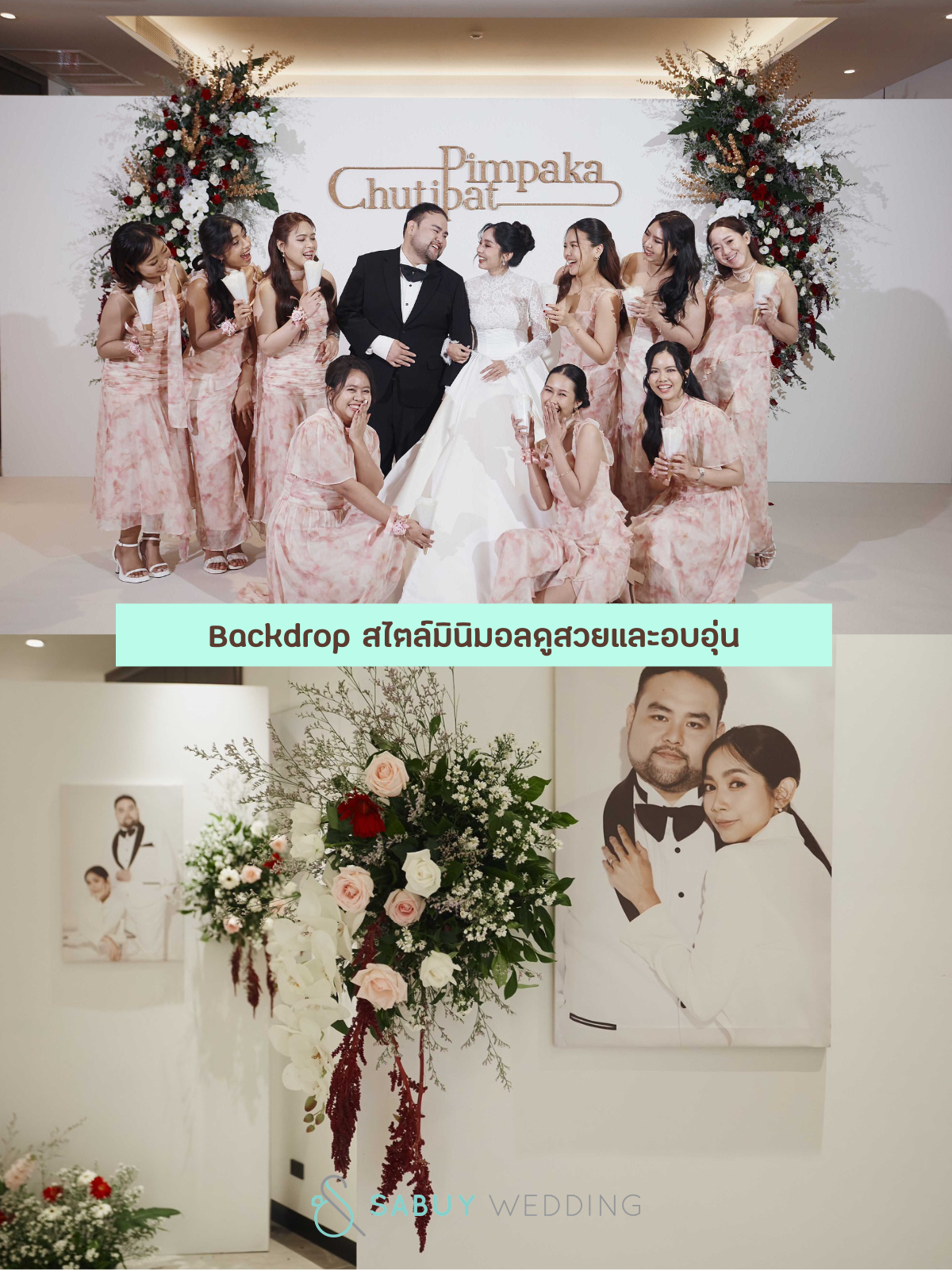 - งานเลี้ยงยังคุมโทนแดง ขาว ครีม โถงหน้าห้องเลือก Backdrop สไตล์มินิมอล ฉากขาวเรียบ ๆ เติมดอกไม้ตามธีมนิดหน่อย ให้เข้ากับแกลลอรี่บล็อกไม้สีขาว ดูสะอาดตาแต่ยังอบอุ่น