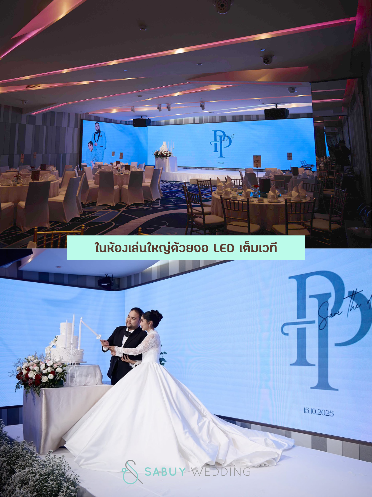 - ไฮไลต์ในห้องจัดงาน คือ ผนังหลังเวทีเป็นจอ LED ยาวเต็มเวที ตกแต่งดอกไม้แค่ขอบเวทีกับโต๊ะเค้กแล้วเน้น Motion Graphic แทน 🎥 บรรยากาศเปลี่ยนตามซีนที่เลือก ทำให้งานดูมีมิติและไม่น่าเบื่อ 🌿
