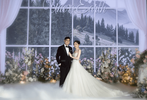 ด้านหน้างานจะมีการตั้งโชว์รูปพรีเวดดิ้งและจัดมุม Backdrop สำหรับถ่ายรูปไว้ให้ค่ะ แล้วพอเข้ามาในโซนห้องจัดงานก็จะเป็นโถงกว้าง ซึ่งเราจัดเลี้ยงแบบโต๊ะจีนก็จะลงโต๊ะเต็มพื้นที่ แต่จะเว้นระยะไว้พอดี ไม่ให้แน่นเกินไป แล้วตรงบันไดวนขึ้นชั้น 2 เราก็ใช้ทำเป็นเวที ฉากใช้ผ้าโปร่งห้อยทิ้งตัวจากชั้น 2 ลงมา แล้วติดอักษรชื่อย่อกับประดับด้วยดอกไม้ใบไม้ค่ะ