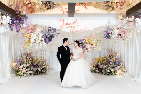 งานตอนเย็นมีแขก 250 ท่าน จึงได้เปลี่ยนมาใช้ห้อง Ballroom ซึ่งงานช่วงนี้เราต้องการให้ออกมาอารมณ์เป็นสวนดอกไม้ มีสีสัน รวมไปถึงไม่อยากกำหนดธีม Dresscode ให้เพื่อนๆ ต้องสิ้นเปลือง จึงได้เลือกธีมเป็น Colouful มีสีหลากหลายครับ
