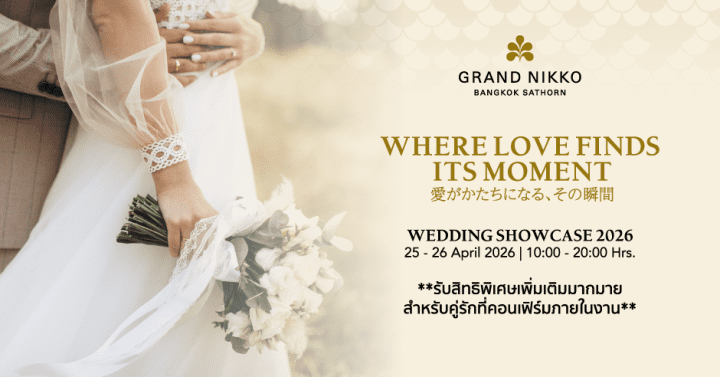 Grand Nikko Bangkok Sathorn (โรงแรมแกรนด์ นิกโก้ กรุงเทพฯ สาทร) สถานที่แต่งงานเปิดใหม่ พร้อมการบริการด้วยใจที่จะช่วยทำให้วันพิเศษของคุณเป็นมากกว่าเวลาที่น่าจดจำ จัด Wedding Showcase วันที่ 25-26 เมษายน 2569 ที่ห้องสาทร แกรนด์ บอลรูม ชั้น 8 เวลา 10.00 - 20.00 น.