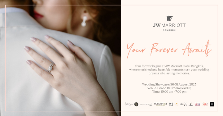 เริ่มต้นเรื่องราวความรักชั่วนิรันดร์ที่ JW Marriott Hotel Bangkok (โรงแรมเจดับบลิว แมริออท กรุงเทพฯ) พร้อมเปลี่ยนทุกช่วงเวลาแห่งความประทับใจของงานแต่งในฝันให้กลายเป็นความทรงจำอันตราตรึง ในงาน Your Forever Awaits Wedding Showcase ในวันที่ 30-31 สิงหาคม 2025 เวลา 10.00 น. – 19.00 น. ณ แกรนด์บอลรูม (ชั้น 3)