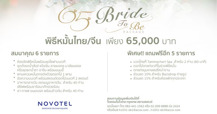 Novotel Bangkok On Siam Square (โนโวเทล กรุงเทพ สยามสแควร์) ออกแพ็กเกจงานหมั้นสุดคุ้ม 65 Bride To Be Package ราคาเพียง 65,000 บาท พร้อมของแถมอีกมากมาย