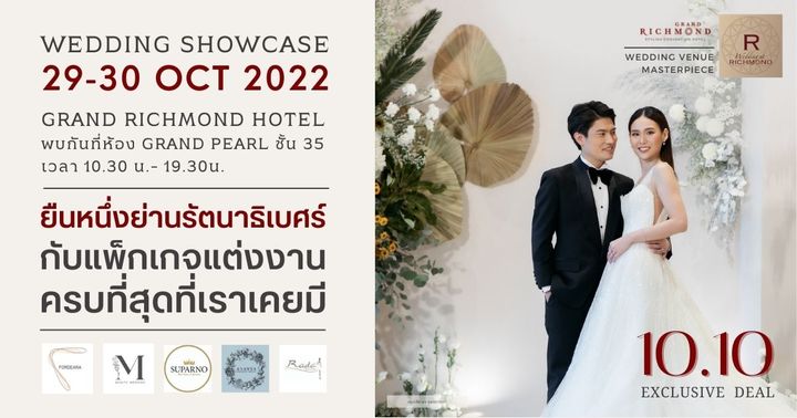 คู่รักที่สนใจ 29-30 ตุลาคม 2565 ตั้งแต่เวลา 10.30-19.30 น. พบกันได้ที่งาน Showcase Exclusive Deal ณ ห้อง Grand Pearl ชั้น 35 ภายในงานได้รวมร้านค้างานแต่งแบรนด์ดังที่ร่วมโปรโมชั่นเด็ด พร้อมการเซ็ตอัพงานตัวอย่าง ให้ทุกท่านได้สัมผัสบรรยากาศเสมือนงานวันจริง