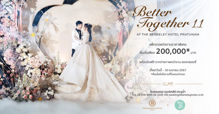 จัดงานแต่งในราคาพิเศษที่ The Berkeley Hotel Pratunam (โรงแรมเดอะ เบอร์เคลีย์ ประตูน้ำ) ตอบโจทย์คู่รักได้ทุกรูปแบบของการจัดงาน เริ่มต้นเพียง 200,000 บาท รับฟรี! ฉากถ่ายภาพหน้างาน และแกลเลอรี ตั้งแต่วันนี้-30 เมษายน 2567 เท่านั้น